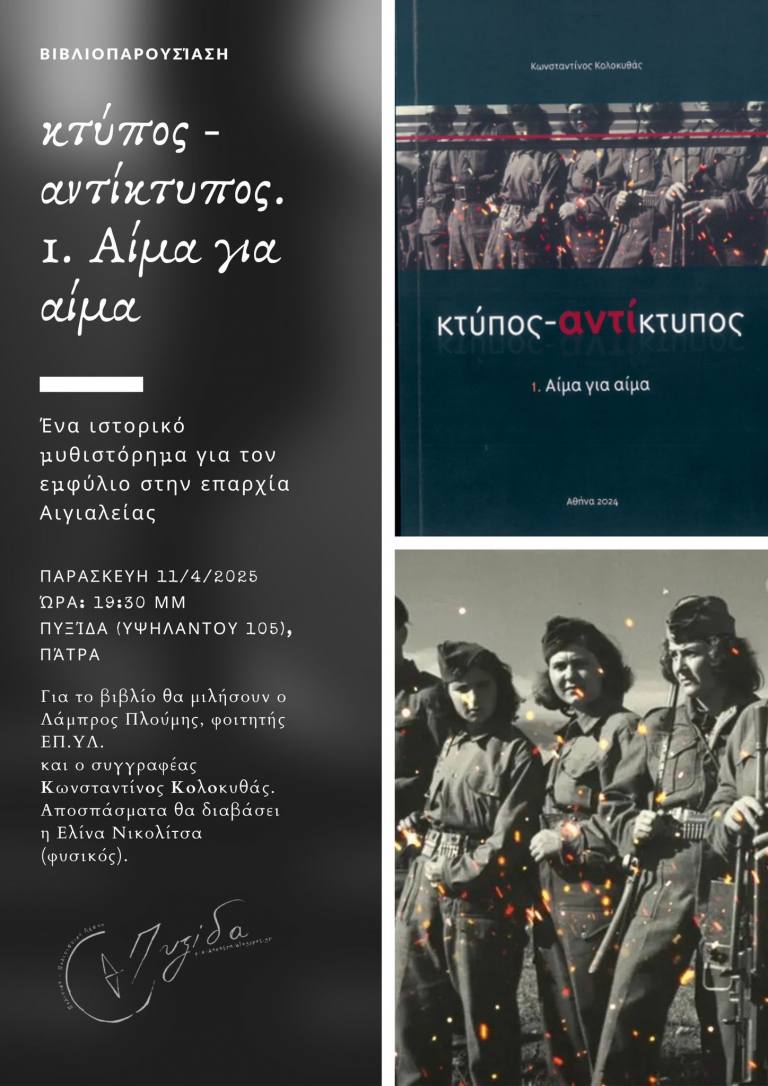 Η πολιτική-πολιτιστική λέσχη Πυξίδα( Αλ. Υψηλάντου 105) σας καλεί την Παρασκευή 11/04 στις 19.30 στην βιβλιοπαρουσίαση του βιβλίου “Κτύπος-αντίκτυπος/Αίμα για αίμα” του Κωνσταντίνου Κολοκυθά. Για το βιβλίο θα μιλήσουν οι: