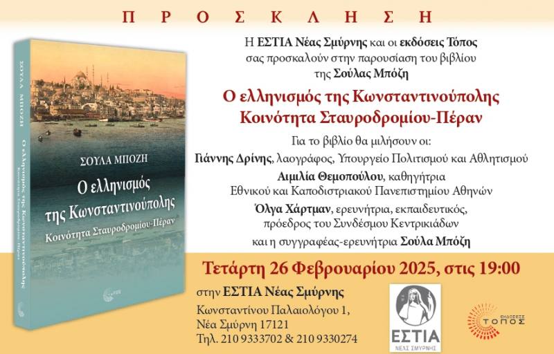 Οι εκδόσεις “Τόπος” και η Εστία Νέα Σμύρνης, σας προσκαλούν στην παρουσίαση του βιβλίου της Σούλας Μπόζη : “Ο ελληνισμός της Κωνσταντινούπολης”, την Τετάρτη 26 Φεβρουαρίου, στις 19:00, στην Εστία Νέας Σμύρνης.