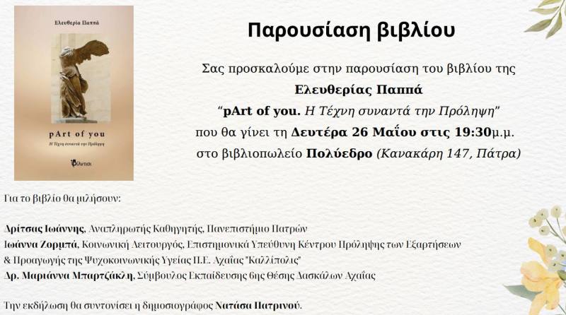 Η συγγραφέας Ελευθερία Παππά αναφέρει: “Με χαρά σας προσκαλώ στην παρουσίαση του βιβλίου μου “pArt of you. Η Τέχνη συναντά την Πρόληψη”,