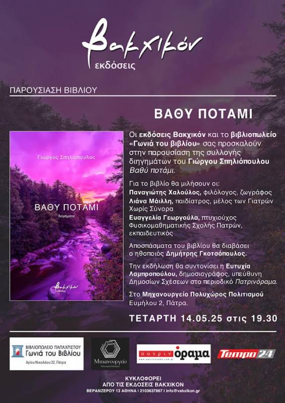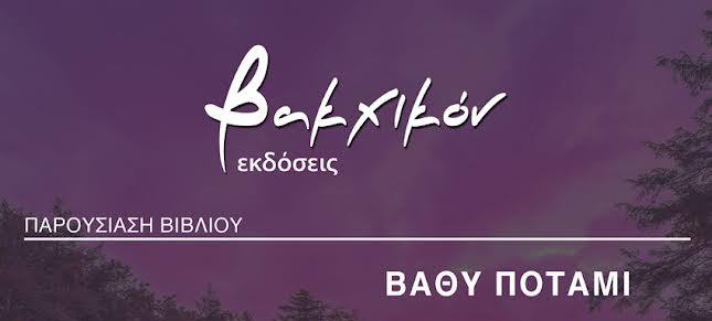 Οι εκδόσεις Βακχικόν και το βιβλιοπωλείο «Γωνιά του βιβλίου» σας προσκαλούν στην παρουσίαση της συλλογής διηγημάτων του Γιώργου Σπηλιόπουλου “Βαθύ ποτάμι”.