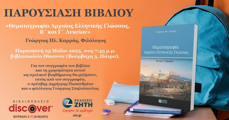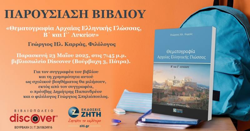 Παρουσίαση βιβλίου «Θεματογραφία Αρχαίας Ελληνικής Γλώσσας» του φιλολόγου Γεώργιου Ηλ. Καρρά στην Πάτρα