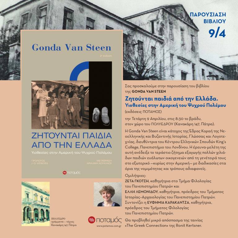 Παρουσιάζεται την Τετάρτη 9 Απριλίου, στις 8:30 το βράδυ, στο Πολύεδρο το βιβλίο «Ζητούνται παιδιά από την Ελλάδα. Υιοθεσίες στην Αμερική του Ψυχρού Πολέμου» της Gonda Van Steen, που κυκλοφορεί από τις εκδόσεις Ποταμός.