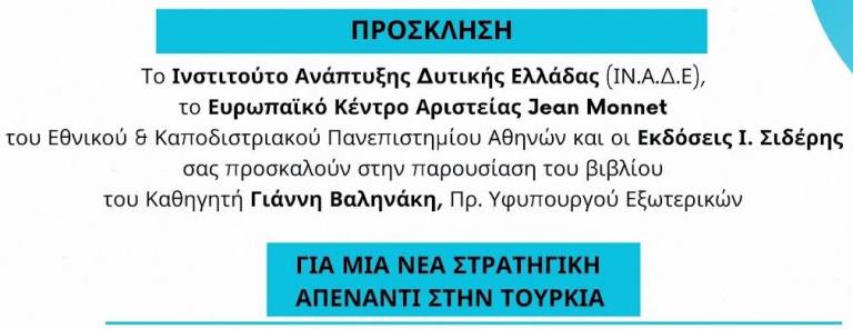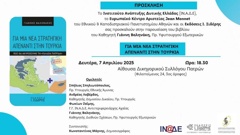 “Για μία νέα στρατηγική απέναντι στην Τουρκία- Πως θα ακυρώσουμε τη «Γαλάζια Πατρίδα»”, ο τίτλος του βιβλίου του πρώην υφυπουργού Εξωτερικών, Καθ. Γιάννη Βαληνάκη, που θα παρουσιαστεί στην Πάτρα, τη Δευτέρα 7 Απριλίου 2025.