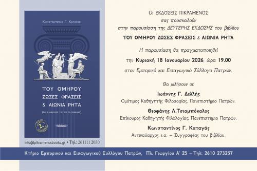 Το βιβλίο παρουσιάζεται στην Πάτρα, την Κυριακή 18 Ιανουαρίου 2026, στις 7.00 το απόγευμα Κτήριο Εμπορικού και Εισαγωγικού Συλλόγου Πατρών, Πλ. Γεωργίου Α´ 25