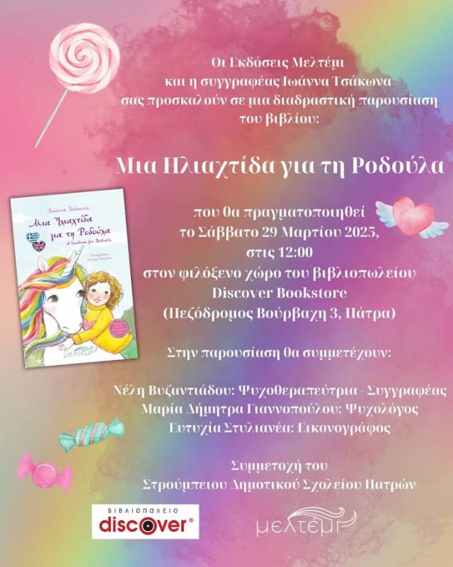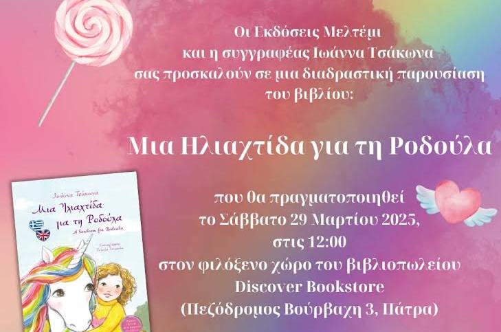 Οι εκδόσεις Μελτέμι, το βιβλιοπωλείο Discover  και η συγγραφέας Ιωάννα Τσάκωνα σας προσκαλούν σε μία διαδραστική παρουσίαση του βιβλίου : «Μία Ηλιαχτίδα για τη Ροδούλα».
