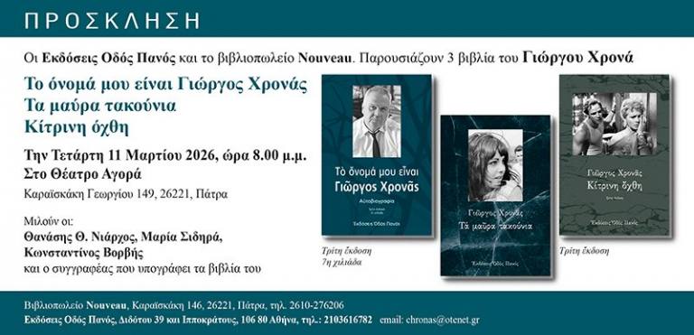 Ο συγγραφέας του θρυλικού βιβλίου Η ΓΥΝΑΙΚΑ ΤΗΣ ΠΑΤΡΑΣ θα παρουσιάσει την αυτοβιογραφία του ΤΟ ΟΝΟΜΑ ΜΟΥ ΕΙΝΑΙ ΓΙΩΡΓΟΣ ΧΡΟΝΑΣ καθώς και τα δύο ποιητικά του βιβλία ΤΑ ΜΑΥΡΑ ΤΑΚΟΥΝΙΑ και ΚΙΤΡΙΝΗ ΟΧΘΗ που επανεκδόθηκαν πρόσφατα.