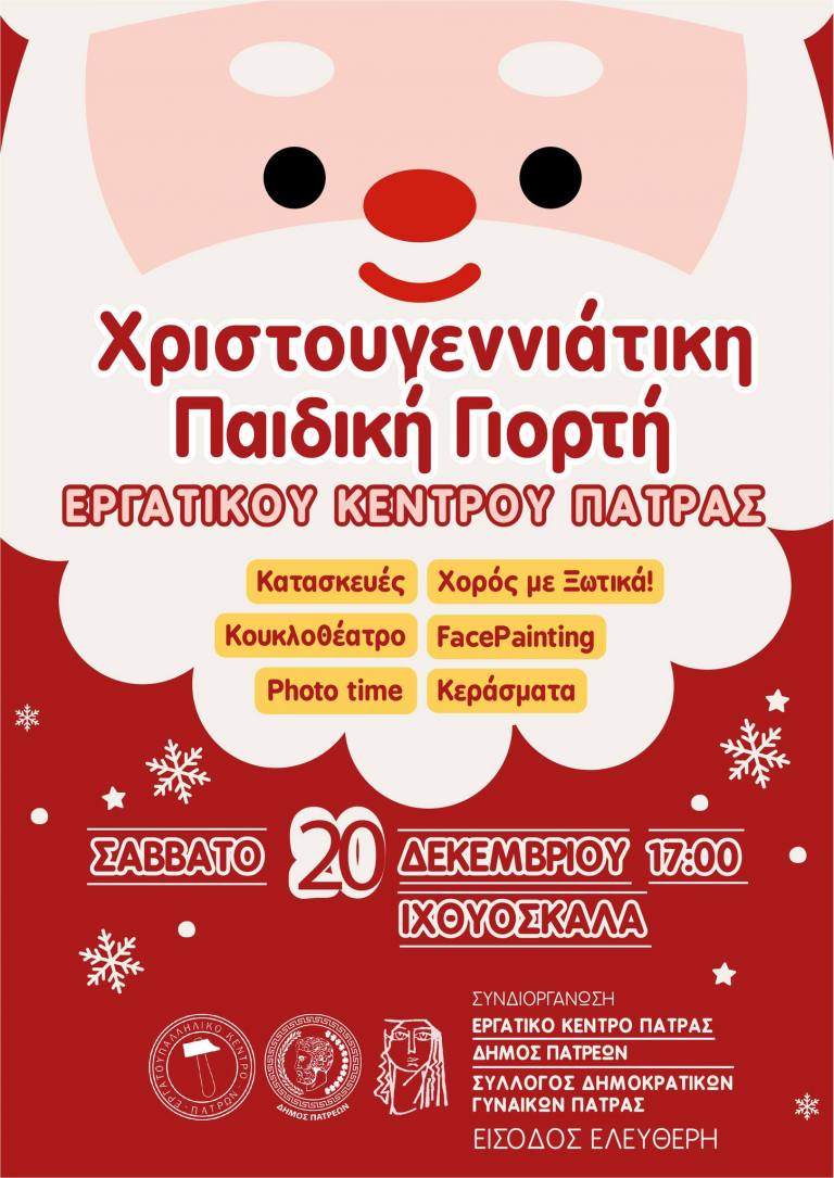 Η Χριστουγεννιάτικη γιορτή για παιδιά που διοργανώνει ο δήμος της Πάτρας σε συνεργασία με το Εργατικό Κέντρο Πάτρας και τον Σύλλογο Δημοκρατικών Γυναικών Πάτρας, οι Εικαστικές Κατασκευές, οι παραστάσεις θεάτρου Σκιών και οι προβολές ταινιών κυριαρχούν στις εκδηλώσεις του Σαββάτου 20, Κυριακής 21 και Δευτέρας 22 Δεκεμβρίου, που διοργανώνει ο Δήμος για τα Χριστούγεννα και την Πρωτοχρονιά.