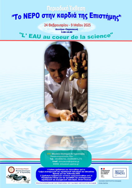 Περιοδική Έκθεση με τίτλο «Το ΝΕΡΟ στην καρδιά της Επιστήμης» διοργανώνεται από το Μουσείο Επιστημών και Τεχνολογίας ΠΠ και το Γαλλικό Ινστιτούτο Ελλάδας στην Πάτρα. Ξεκινά τη Δευτέρα 24 Φεβρουαρίου και θα ολοκληρωθεί στις 9 Μαΐου 2025. Τα εγκαίνια της Περιοδικής έκθεσης θα πραγματοποιηθούν με ειδική εκδήλωση με τίτλο «Όλοι μαζί για το νερό και το νερό για όλους» την Κυριακή 16 Μαρτίου 2025, στις 18.30, στο Μουσείο Επιστημών και Τεχνολογίας, στο πλαίσιο του Εορτασμού της Γαλλοφωνίας.