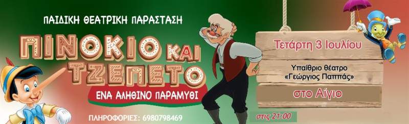 Η πιο γοητευτική κλασσική ιστορία του κόσμου, του ξύλινου παιδιού με την χρυσή καρδιά και τον αδαμάντινο χαρακτήρα, παρουσιάζεται στο υπαίθριο θέατρο «Γεώργιος Παππάς» στο Αίγιο την Τετάρτη 3 Ιουλίου, για μία μόνο παράσταση στις 21:00 !!