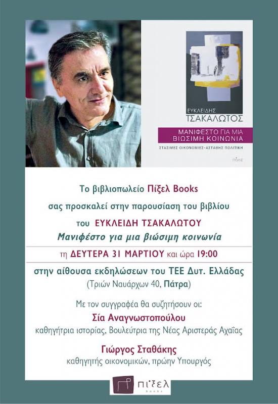 Η Νέα Αριστερά Αχαΐας καλεί όλους και όλες, όσοι ενδιαφέρονται, για μια κοινωνία βιώσιμη, που συμπεριλαμβάνει όλους τους πολίτες ισότιμα, να παραβρεθούν στην παρουσίαση του βιβλίου του Ευκλείδη Τσακαλώτου , Μανιφέστο για μια βιώσιμη κοινωνία,