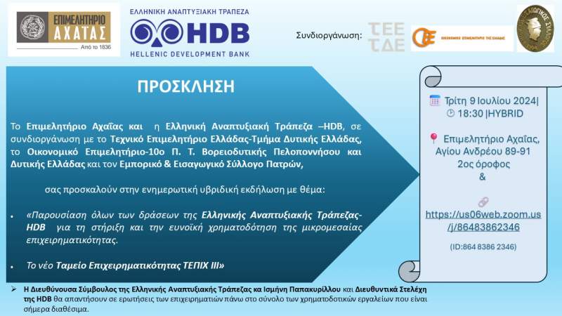 Το Επιμελητήριο Αχαΐας και η Ελληνική Αναπτυξιακή Τράπεζα– HDB, σε συνδιοργάνωση με το Τεχνικό Επιμελητήριο Ελλάδας-Τμήμα Δυτικής Ελλάδας, το Οικονομικό Επιμελητήριο-10o Π. Τ. Βορειοδυτικής Πελοποννήσου και Δυτικής Ελλάδας και τον Εμπορικό & Εισαγωγικό Σύλλογο Πατρών,