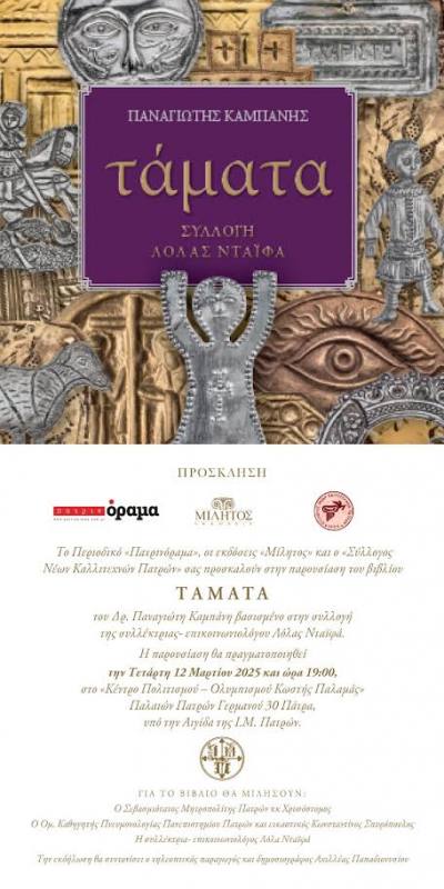 Το περιοδικό “Πατρινόραμα”, οι εκδόσεις “Μίλητος” και ο “Σύλλογος Νέων Καλλιτεχνών Πατρών” σας προσκαλούν στην παρουσίαση του βιβλίου “ΤΑΜΑΤΑ” του Δρ. Παναγιώτη Καμπάνη, βασισμένο στη συλλογή της συλλέκτριας – επικοινωνιολόγου Λόλας Νταϊφά.