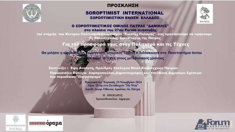 Η εκδήλωση θα γίνει στα πλαίσια του 27ου FORUM την Κυριακή 24 Νοεμβρίου στην αίθουσα εκδηλώσεων του ξενοδοχείου «My Way” στις 10 πμ. Μια ιδιαίτερη εκδήλωση που τιμά τις Καλλιτέχνιδες της Πάτρας που με μεγάλη αγάπη και ευαισθησία έχουν προσφερθεί να διαθέσουν τα έσοδα των καλλιτεχνικών τους δημιουργιών για σκοπούς αλληλεγγύης, στήριξης και ανακούφισης κυρίως των ευπαθούντων συμπολιτών μας.
