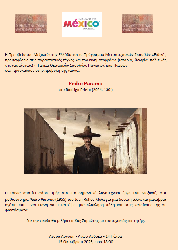 Η Πρεσβεία του Μεξικού στην Ελλάδα και το Πρόγραμμα Μεταπτυχιακών Σπουδών «Ειδικές προσεγγίσεις στις παραστατικές τέχνες και τον κινηματογράφο (ιστορία, θεωρία, πολιτικές της ταυτότητας)» του τμήματος Θεατρικών Σπουδών του Πανεπιστημίου Πατρών παρουσιάζουν την ταινία Pedro Páramo του Rodrigo Prieto (2024) στην Αγορά Αργύρη στην Πάτρα, την Τετάρτη, 15 Οκτωβρίου 2025 και ώρα 18:00.