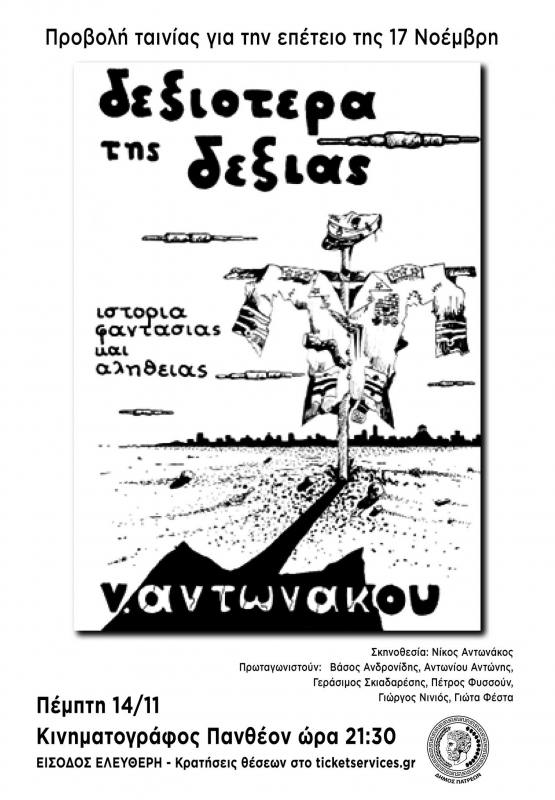 Οι εκδηλώσεις που διοργανώνει ο Δήμος Πατρέων για την συμπλήρωση 51 χρόνων από την εξέγερση του Πολυτεχνείου, συνεχίζονται στις 9.30 το βράδυ την Πέμπτη 14 Νοεμβρίου στο «Πάνθεον» με την προβολή της ταινίας του Νίκου Αντωνάκου «Δεξιότερα της δεξιάς» με πρωταγωνιστές τους Βάσο Ανδρονίδη, Αντωνίου Αντώνη, Γεράσιμο Σκιαδαρέση, Πέτρο Φυσσούν, Γιώργο Νινιός και Γιώτα Φέστα.