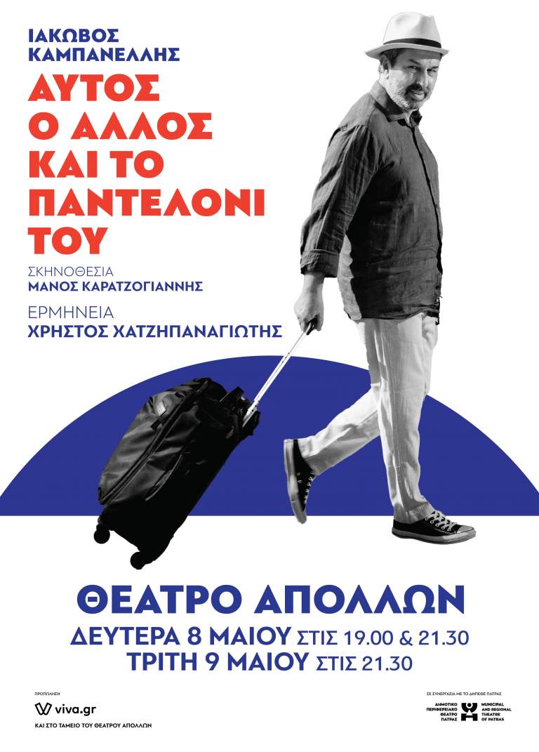 Η τόσο αστεία όσο και συγκινητική παράσταση – φόρος τιμής στον πατριάρχη του νεοελληνικού θεάτρου – που παρουσιάστηκε το περασμένο καλοκαίρι στον Πύργο Μπαζαίου στο πλαίσιο του Φεστιβάλ Νάξου, γενέτειρας του Ιάκωβου Καμπανέλλη και σε επιλεγμένες πόλεις της Ελλάδας, αποσπώντας εξαιρετικές κριτικές θα παρουσιαστεί για τρεις μόνο παραστάσειςσε συνεργασία με το ΔΗΠΕΘΕ ΠΑΤΡΑΣστο