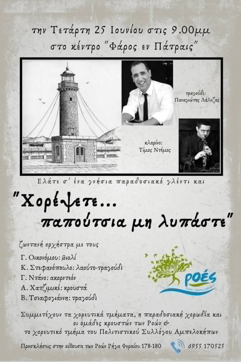 Οι Ροές, Χορός – Δράσεις Πολιτισμού, σας προσκαλούν την Τετάρτη 25 Ιουνίου σε ένα παραδοσιακό γλέντι, στο Φάρο της Πάτρας δίπλα στη θάλασσα, με τον Παναγιώτη Λάλεζα.