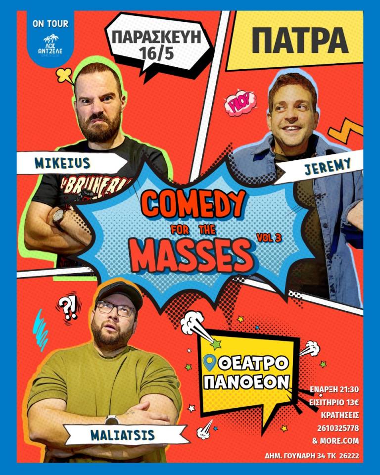 Μετά από δύο σεζόν γεμάτες sold out και αμέτρητα memes, το Comedy for the Masses γίνεται θεσμός και βάζει πλώρη για ακόμη περισσότερες πόλεις σε όλη την Ελλάδα. Το tour του 2025 είναι γεγονός – κι αν νομίζεις πως τα έχεις δει όλα… ξανασκέψου το.