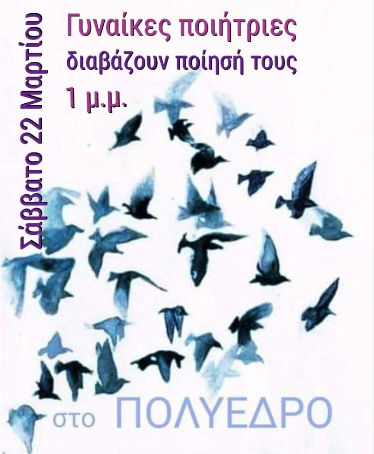 Στα πλαίσια της Εβδομάδας Ποίησης που διοργανώνει το Πολύεδρο, το μεσημέρι του Σαββάτου 22 Μαρτίου, 1 το μεσημέρι, Γυναίκες ποιήτριες που ζουν στην Πάτρα διαβάζουν ποίηση τους. Τα τελευταία χρόνια έχει αναπτυχθεί η παρουσία των γυναικών που γράφουν ποίηση στην πόλη μας και έχουν εκδοθεί ποιητικές συλλογές τους.