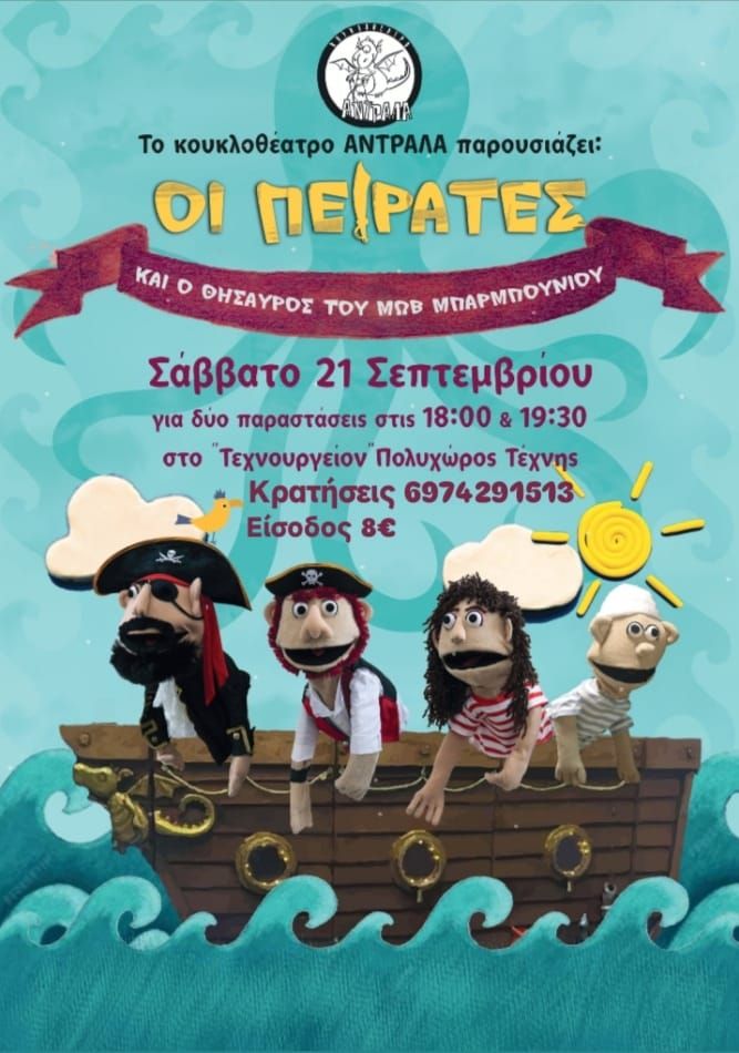 “Οι πειρατές και ο θησαυρός του μωβ μπαρμπουνιού” το Σάββατο 21 Σεπτέμβρη για 2 παραστάσεις στο Τεχνουργείον Πολυχώρος Τέχνης στη Ναύπακτο στις 18:00 και 19:30!