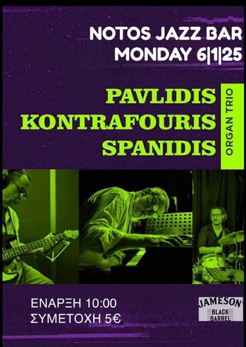 Την Δευτέρα 6/1/25 ο Νότος φιλοξενεί τρεις βιρτουόζους καλλιτέχνες της jazz, τον κιθαρίστα και συνθέτη Γιάννη Παυλίδη από το Leeds, τον πιανίστα και οργανίστα Γιώργο Κοντραφούρη και τον ντράμερ από τη Θεσσαλονίκη Αλέκο Σπανίδη.