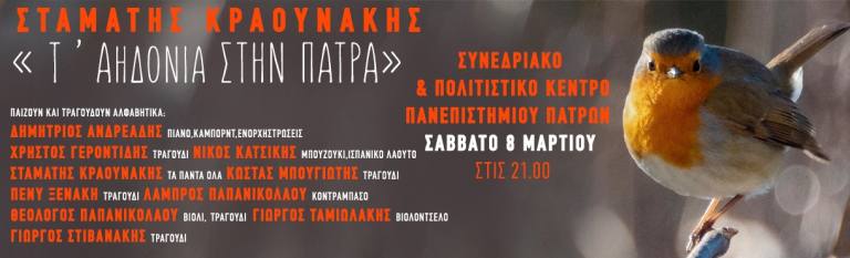 Ηλεκτρονική προπώληση: https://www.more.com/gr-el/tickets/music/taidonia-stin-patra-stamatis-kraounakis/?gad_source=1&gclid=CjwKCAiAw5W-BhAhEiwApv4goB9Yt2KkZgjedPwo8T_CHJg96Z7ayv0vQD2NdKhFl9HURVRsVjma_hoCOAUQAvD_BwE