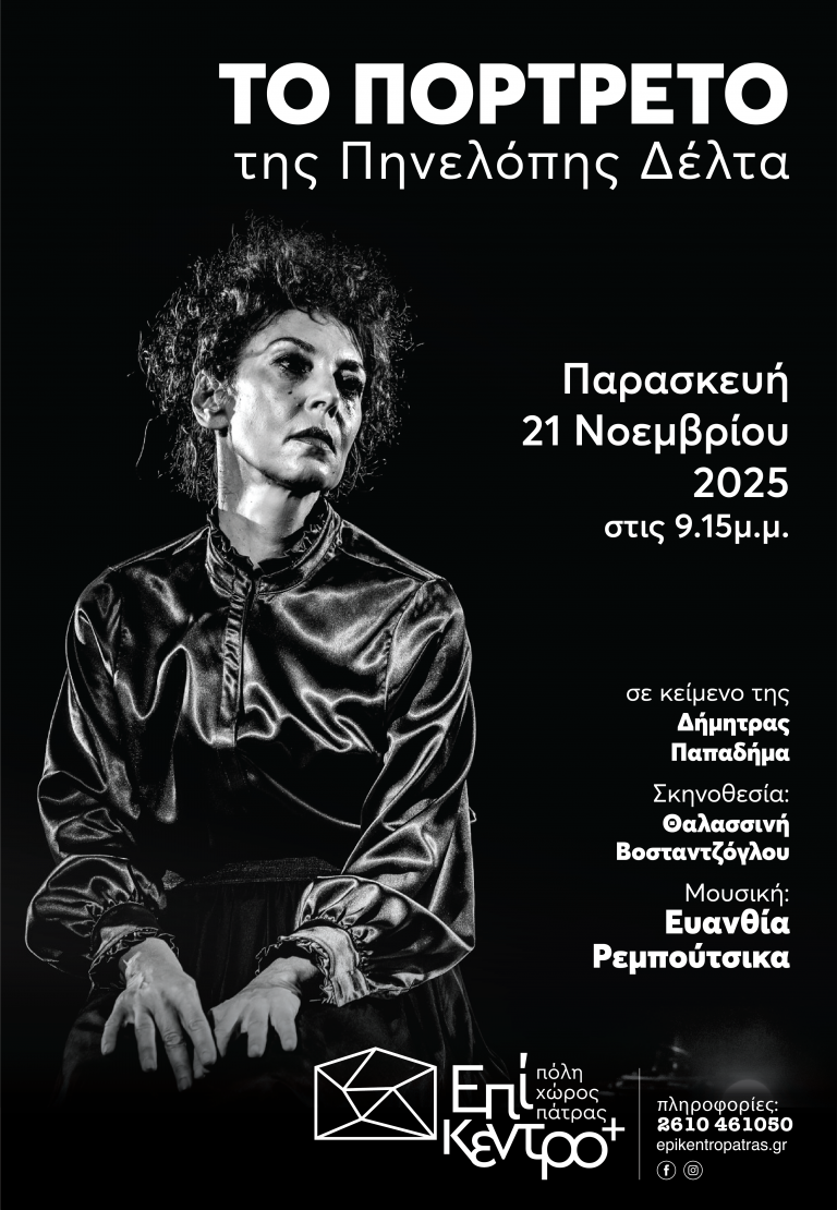 Το Πορτραίτο της Πηνελόπης Δέλτα με τη Δήμητρα Παπαδήμα σε σκηνοθεσία Θαλασσινής Βοσταντζόγλου επιστρέφει στην Πάτρα μία παράσταση, την Παρασκευή 21 Νοεμβρίου στο θέατρο Επίκεντρο+.
