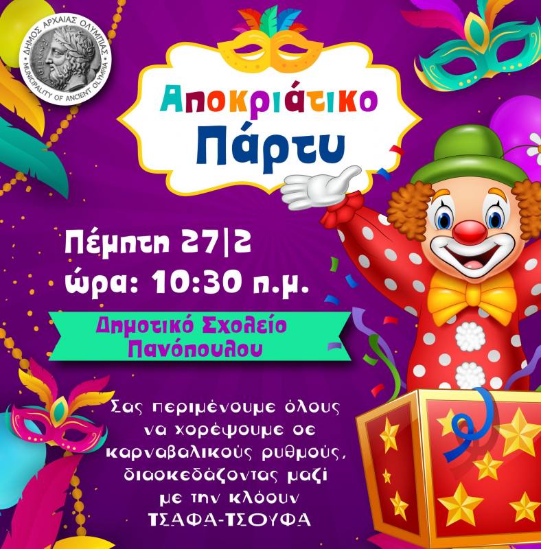Μαγικά κόλπα, παιχνίδια, χορός και πολλές εκπλήξεις περιμένουν τους μικρούς μας φίλους, οι οποίοι θα διασκεδάσουν σε καρναβαλικούς ρυθμούς μαζί με την κλόουν ΤΣΑΦΑ-ΤΣΟΥΦΑ, στα αποκριάτικα πάρτι που ετοιμάζει ο Δήμος Αρχαίας Ολυμπίας.
