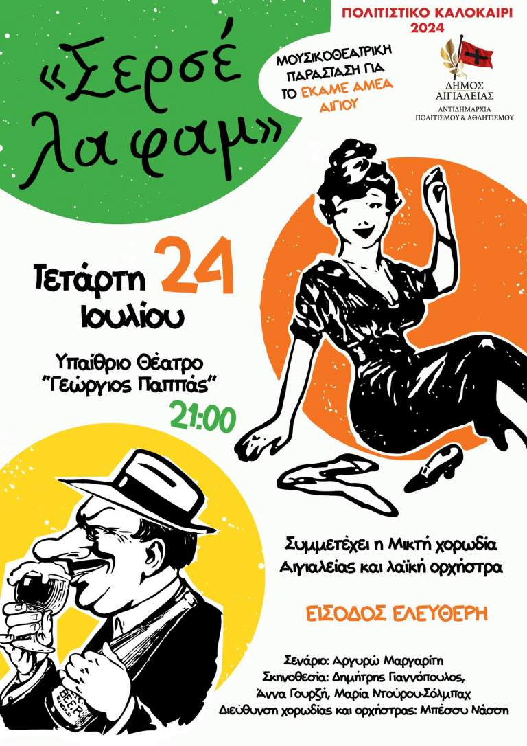 Ο Δήμος Αιγιαλείας, για τρίτη συνεχόμενη χρονιά, διοργανώνει μια εκδήλωση για την στήριξη του ΕΚΑΜΕ ΑμεΑ Αιγίου. Την Τετάρτη 24 Ιουλίου 2024 και ώρα 21.00 στο υπαίθριο θέατρο «Γ. Παππάς», η Μικτή Χορωδία Αιγιαλείας παρουσιάζει την πρωτότυπη παράσταση με τίτλο «Σερσέ λα φαμ».