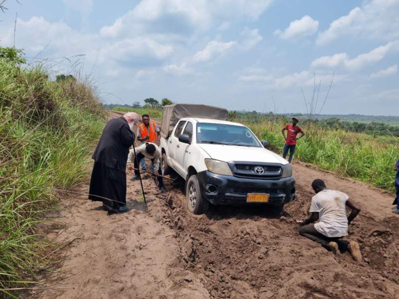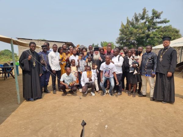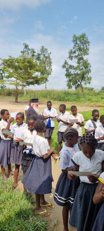 Η Ιεραποστολική ομάδα του Σεβασμιωτατου Κινσάσας Θεοδοσίου για το χωριό Κάνγκα. Αφού διέσχισαν το δάσος περνώντας μέσα από τις φτωχικές καλύβες των ανθρώπων, έφθασαν στην ενορία της Κάνγκα όπου ο Ναός της Υπαπαντής και το σχολείο του Αγίου Νεκταρίου. Εκεί οι μαθητές του Δημοτικού καλωσόρισαν τους επισκέπτες ψαλλοντας τον Αναστάσιμο παιάνα ” Χριστός ανέστη….” αλλά και άλλους Ύμνους και τραγούδια. Ο Μητροπολίτης αφού μίλησε με αγάπη στα παιδιά για την μεγάλη εορτή της Αναστάσεως, μαζί με τους συνεργάτες του μοναχούς και την ιεραπόστολο κυρία Στέλλα Παπαδοπούλου μοίρασαν αναστάσιμες κάρτες, τετράδια, μολύβια, στυλούς, μπάλες και μπισκότα, προσφορά του Προέδρου της Ελληνικής Κοινότητας Κινσάσας κ Γερασίμου Ντούνη. Στην συνέχεια η Ιεραποστολική ομάδα σταματούσε σε όλες τις καλύβες του χωριού προσφέροντας σε όλο τον κόσμο ρύζι, φασόλια, αλάτι και φάρμακα προσφορά και πάλι του κ. Γερασίμου Ντούνη. Τόσο η Ιερά Μητρόπολις, όσο και οι πιστοί της, ευχαριστούν τον κ. Γεράσιμο Ντούνη και την εκλεκτή σύζυγο του ιατρό κυρία Παρασκευή Τριαντάφυλλου Ντούνη για την έκδηλη αγάπη τους κατά την εορτή του Πάσχα στους φτωχούς αδελφούς.