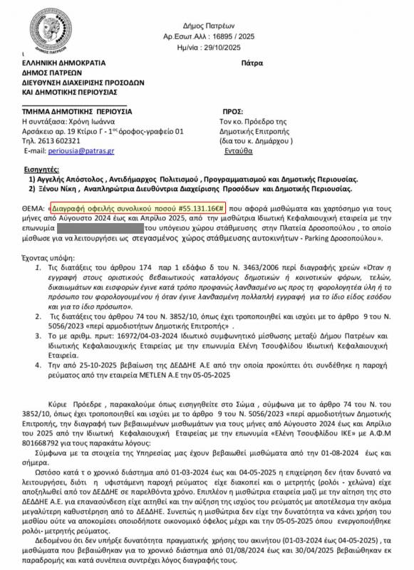 Από την πλευρά της αρμόδιας Αντιδημαρχίας Δημοτικής Περιουσίας, από την άλλη, δεν κρίθηκε σκόπιμο ούτε συγνώμη να ζητηθεί, ούτε καν πολιτική ευθύνη να αναληφθεί για ομολογημένο δημοτικό λάθος που στοίχισε στον Δήμο Πατρέων 55.000 ευρώ. Ο λόγος για «διαγραφή οφειλής συνολικού ποσού €55.131,16 που αφορά μισθώματα και χαρτόσημο για τους μήνες από Αύγουστο 2024 έως και Απρίλιο 2025» σε μισθωμένο ακίνητο του δήμου. Το θέμα εισηγήθηκε ο αρμόδιος Αντιδήμαρχος στην Δημοτική Επιτροπή της περασμένης Τρίτης, όπου υπηρεσιακοί παράγοντες ισχυρίστηκαν πως πρέπει να υπερψηφιστεί γιατί «το λάθος είναι του δήμου».