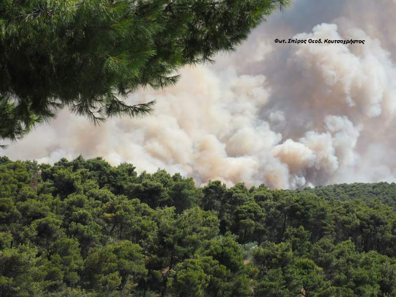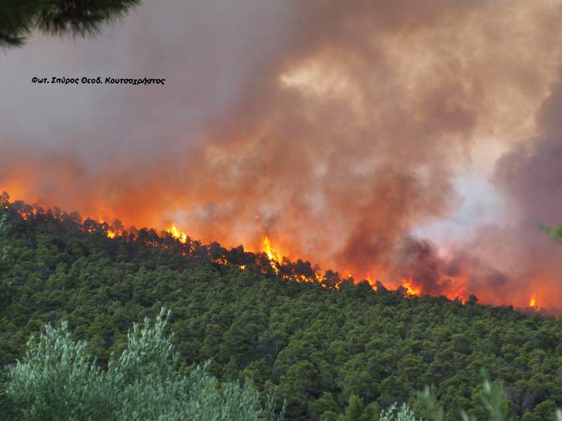 Υψηλές θερμοκρασίες , συνεχής εναλλαγή των ανέμων με υψηλό θερμικό φορτίο, λόγω της καύσης ” ρητινοφόρου δάσους – πεύκης “.
