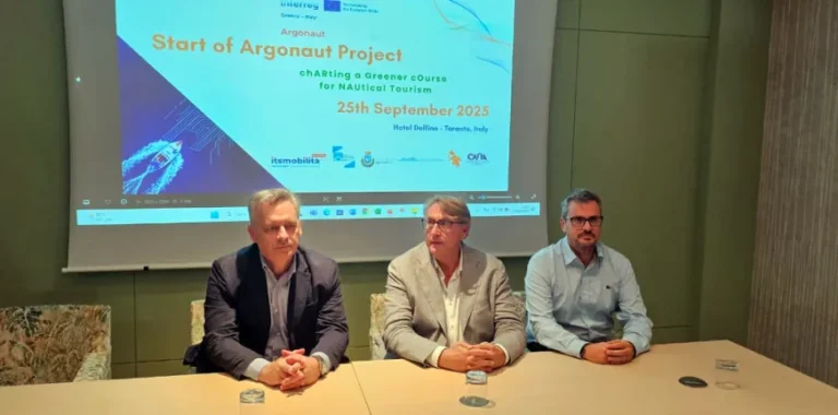Στο Τάραντο της Ιταλίας βρέθηκαν στις 24 και 25 Σεπτεμβρίου ο Γενικός Γραμματέας της Αποκεντρωμένης Διοίκησης Πελοποννήσου, Δυτικής Ελλάδας και Ιονίου Δρ. Δημήτρης Κατσαρός, ο Συντονιστής Δρ. Στέφανος Μίχος και στελέχη της ομάδας έργου του Φορέα, συμμετέχοντας στην εναρκτήρια συνάντηση του έργου ARGONAUT, μιας διασυνοριακής πρωτοβουλίας στο πλαίσιο του Προγράμματος Interreg VI-A Ελλάδα–Ιταλία 2021–2027, που στοχεύει στην προώθηση της βιώσιμης ναυτιλίας και του «πράσινου» θαλάσσιου τουρισμού.