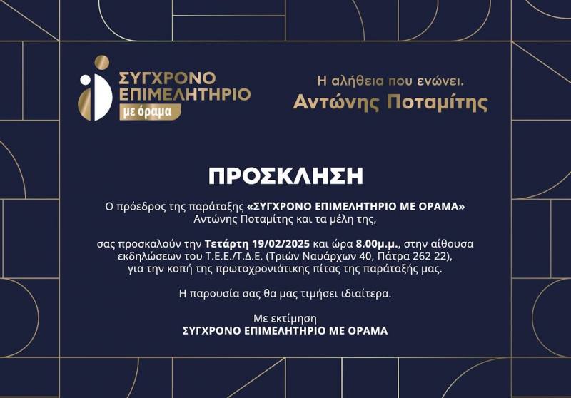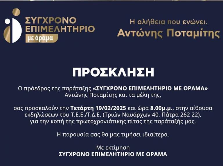 Στην αίθουσα εκδηλώσεων του ΤΕΕ Δυτικής Ελλάδος στην Πάτρα (Τριών Ναυάρχων 40) θα πραγματοποιηθεί την Τετάρτη 19 Φεβρουαρίου, στις 8 το βράδυ, η εκδήλωση κοπής της πρωτοχρονιάτικης πίτας της παράταξης «ΣΥΓΧΡΟΝΟ ΕΠΙΜΕΛΗΤΗΡΙΟ με όραμα».