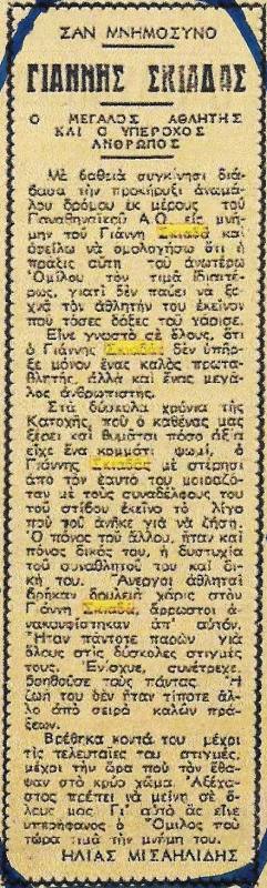 Συμπληρώνονται σήμερα ογδόντα χρόνια από τη θλβερή μέρα του χαμού του κορυφαίου βαλκανιονίκη και ολυμπιακού αθλητή του μεσοπολέμου Γιάννη Σκιαδά, που άφησε την τελευταία του πνοή μόλις στα τριάντα ένα χρόνια του νικημένος από μιάν απροδόκητη νεφρική ανεπάρκεια.