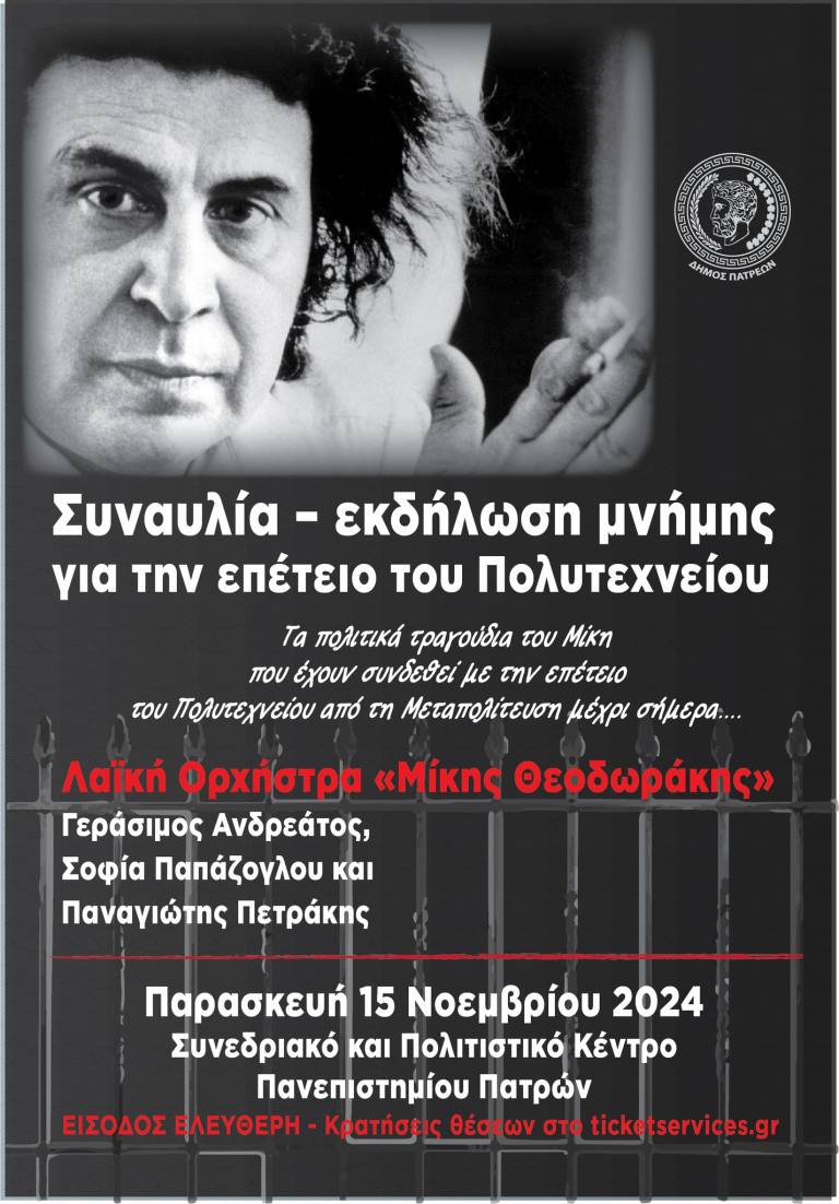 Την Παρασκευή 15 Νοεμβρίου στις 9.00 το βράδυ στο Συνεδριακό και Πολιτιστικό Κέντρο Πανεπιστημίου Πατρών, θα πραγματοποιηθεί Συναυλία – εκδήλωση μνήμης για την επέτειο του Πολυτεχνείου με την Λαϊκή Ορχήστρα «Μίκης Θεοδωράκης».