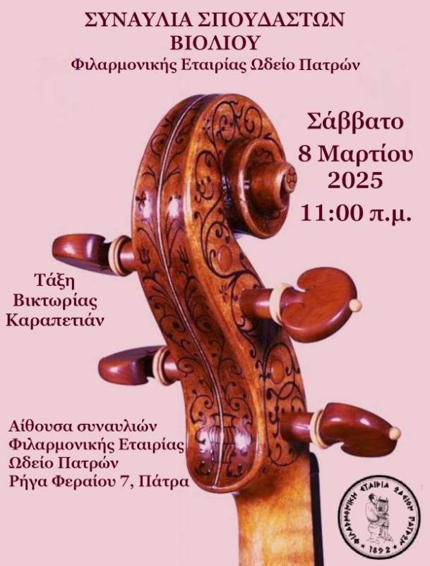 Το Σάββατο 08 Μαρτίου 2025, στις 11.00π.μ. θα πραγματοποιηθεί συναυλία σπουδαστών της Σχολής Βιολιού της Φιλαρμονικής Εταιρίας Ωδείο Πατρών, τάξη της καθηγήτριας Βικτωρίας Καραπετιάν.