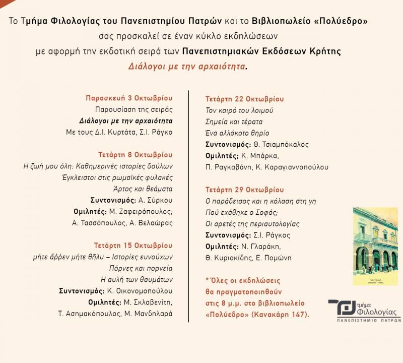 Συνεχίζεται την Τετάρτη 15 Οκτωβρίου, στις 8 το βράδυ, στο Πολύεδρο, ο κύκλος εκδηλώσεων “Διάλογοι με την αρχαιότητα“, με συντονίστρια την Κατερίνα Οικονομοπούλου, Επίκουρη καθηγήτρια Αρχαίας Ελληνικής Φιλολογίας στο Πανεπιστήμιο Πατρών.