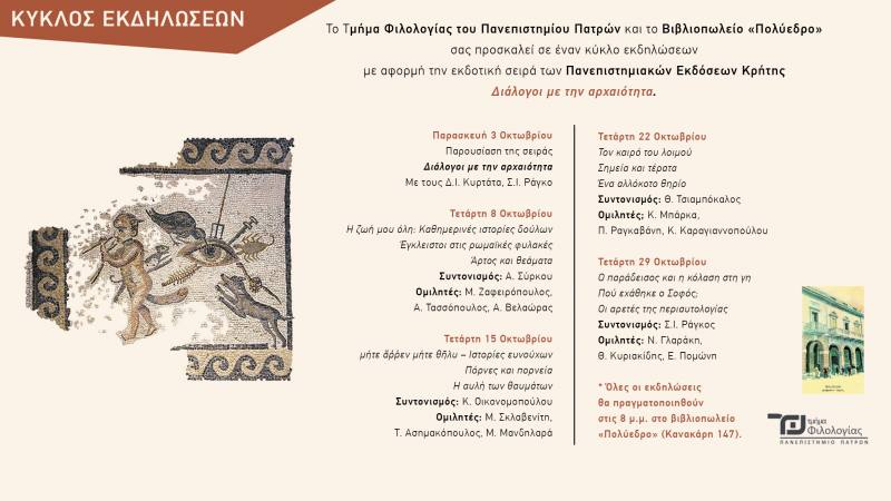 Με αφορμή την ομότιτλη εκδοτική σειρά των Πανεπιστημιακών Εκδόσεων Κρήτης, σε συνεργασία με το Τμήμα Φιλολογίας του Πανεπιστημίου Πατρών, παρουσιάζονται κάθε Τετάρτη του Οκτωβρίου, τρία διαφορετικά βιβλία.