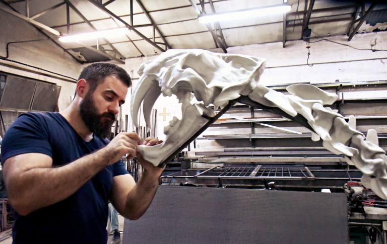 Θρυαλλίδα για το όλο εγχείρημα αποτέλεσε η ανακάλυψη ενός υπερμεγέθους κρανίου του μεγαλύτερου είδους των σμιλοδόντων, του Smilodon Populator, στην Limetas Creek της Ουρουγουάης. Το περίφημο δείγμα ΜΝΗN-P 957, ένα διαμάντι της παλαιοβιολογίας. Το σύστημα υπολογισμών μάζας Van Valkenburgh & Prevosti, αποκάλυψε ότι αυτό το συγκεκριμένο κρανίο ανήκε πριν 11.000 έτη, σε έναν σμιλόδοντα 436 κιλών, έναν apex predator της τροφικής αλυσίδας τότε. Όταν υπέπεσε στην αντίληψη μου η είδηση, την ίδια ημέρα επικοινώνησα με τον υπεύθυνο μελέτης, τον κύριο Aldo Manzuetti και του εξέφρασα την επιθυμία μου να δημιουργήσω με βάση το εύρημα, ολόκληρο τον σκελετό του θηρίου. Εκείνος και οι συνεργάτες του εντυπωσιάστηκαν και για τους επόμενους 7 μήνες μου απέστελλαν λεπτομερές υλικό για την ανατομία του είδους. Αποτέλεσμα ένας πήλινος σκελετός ενισχυμένος με οπλισμό, κλίμακας 1:1 και μήκους 3 μέτρων, τον οποίο και σαρώσαμε ψηφιακά σε εγκαταστάσεις των Αθηνών, με την στήριξη χρηματοδοτικού προγράμματος της Ε.Ε.