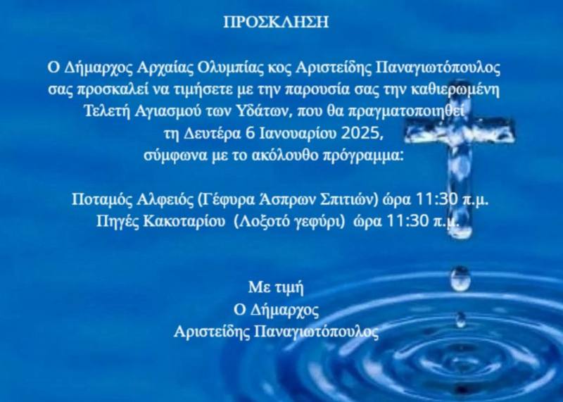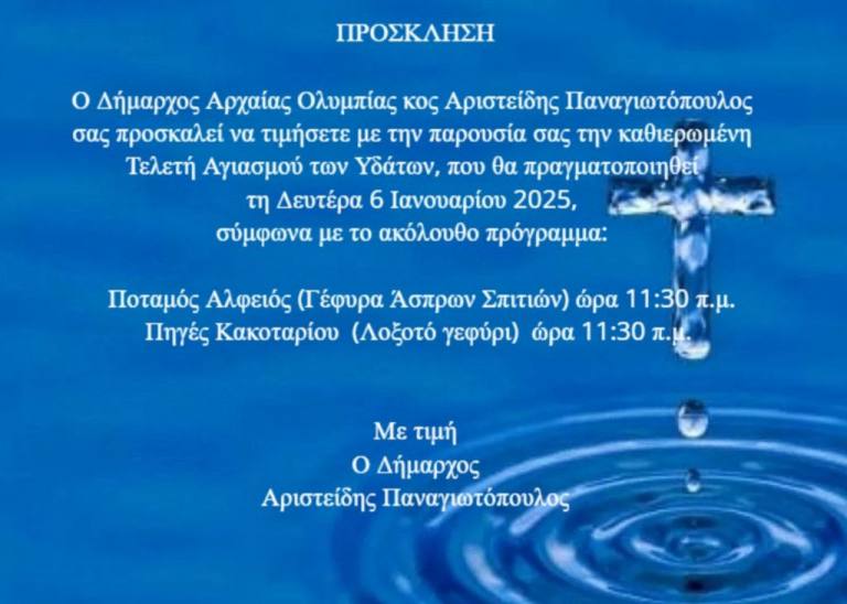 Ο Δήμαρχος Αρχαίας Ολυμπίας, Αριστείδης Παναγιωτόπουλος, σας προσκαλεί να τιμήσετε με την παρουσία σας την καθιερωμένη Τελετή Αγιασμού των Υδάτων, που θα πραγματοποιηθεί την Δευτέρα 6 Ιανουαρίου 2025, σύμφωνα με το ακόλουθο πρόγραμμα: