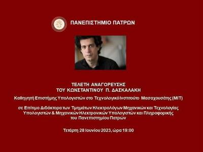 O Καθηγητής Επιστήμης Υπολογιστών του Τεχνολογικού Ινστιτούτου Μασαχουσέτης (ΜΙΤ), Κωνσταντίνος Π. Δασκαλάκης θα αναγορευθεί Επίτιμος Διδάκτορας των Τμημάτων Ηλεκτρολόγων Μηχανικών και Τεχνολογίας Υπολογιστών και Μηχανικών Ηλεκτρονικών Υπολογιστών και Πληροφορικής την Τετάρτη 28 Ιουνίου και ώρα 19:00 στην Αίθουσα Τελετών του Πανεπιστημίου Πατρών.