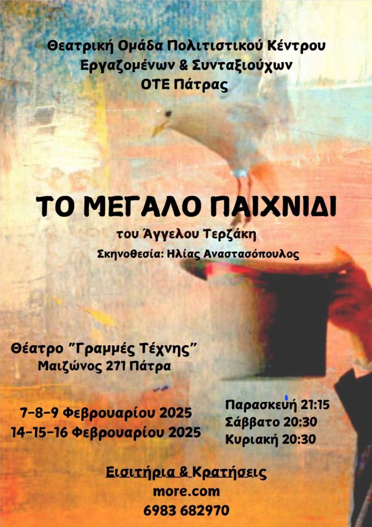 Η θεατρική ομάδα του Πολιτιστικού Κέντρου Εργαζομένων & Συνταξιούχων ΟΤΕ Πάτρας ανεβάζει το έργο «Το Μεγάλο Παιχνίδι» του Άγγελου Τερζάκη σε σκηνοθεσία Ηλία Αναστασόπουλου.