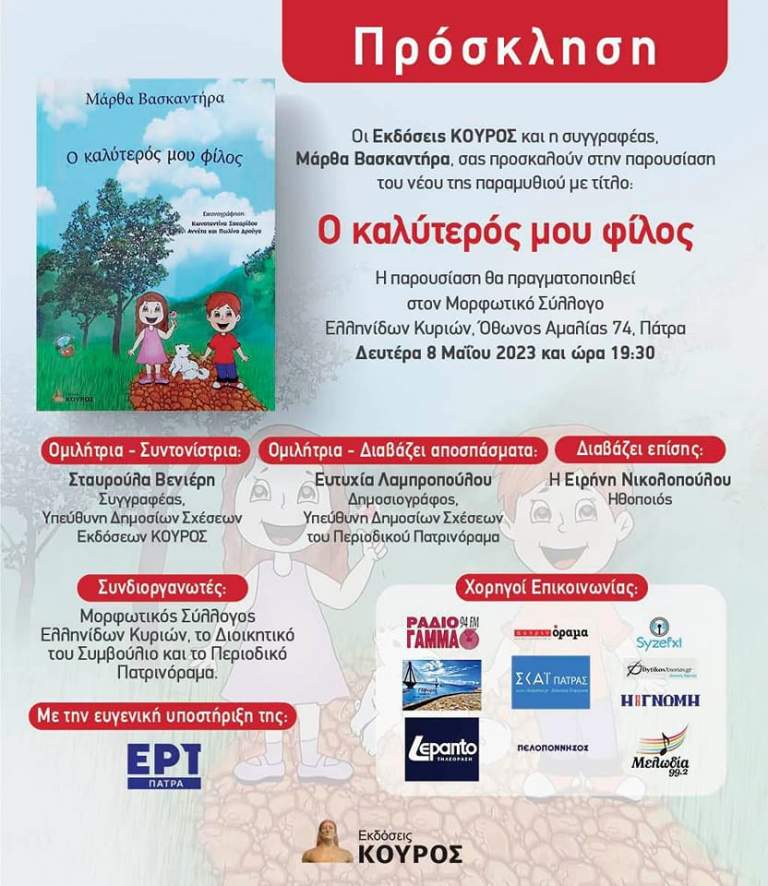 Τη Δευτέρα 8 Μαΐου στις 7.30 το βράδυ, στην αίθουσα του Μορφωτικού Συλλόγου Ελληνίδων Κυριών Πάτρας, θα πραγματοποιηθεί η παρουσίαση του νέου παραμυθιού της συγγραφέως Μάρθας Βασκαντήρα «Ο καλύτερος μου φίλος», από τις εκδόσεις «Κούρος».
