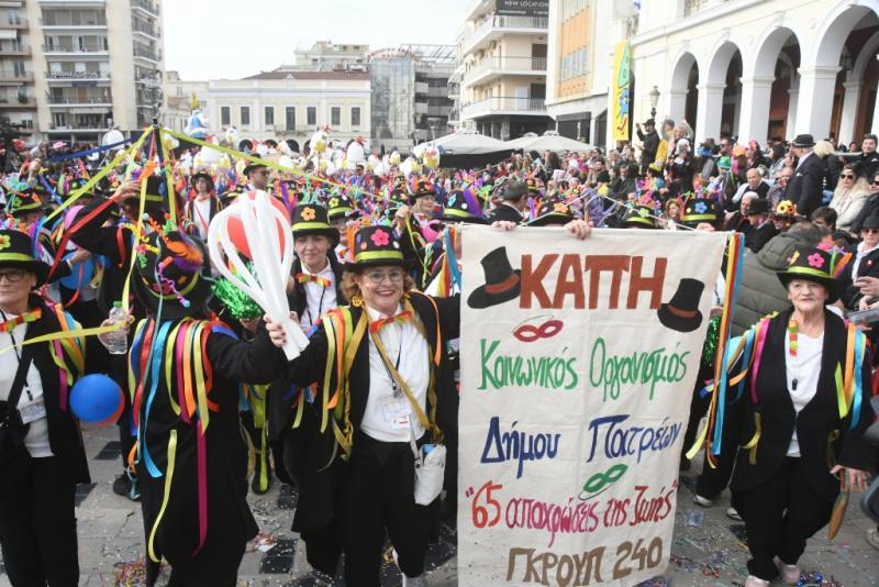 Μια πρωτόγνωρη εμπειρία είχαν 60 μέλη των τριών ΚΑΠΗ του Κοινωνικού Οργανισμού του Δήμου Πατρέων (ΚΟΔΗΠ) στο φετινό Καρναβάλι. Συμμετείχαν με εργαζόμενους του Τμήματος Τρίτης Ηλικίας, που τους συνόδευαν, στη μεγάλη κυριακάτικη καρναβαλική παρέλαση. Άτομα 65+ μέχρι κι ως 85!!! ετών, αποτέλεσαν το γκρουπ Νο 240 με τίτλο «65 αποχρώσεις της ζωής».