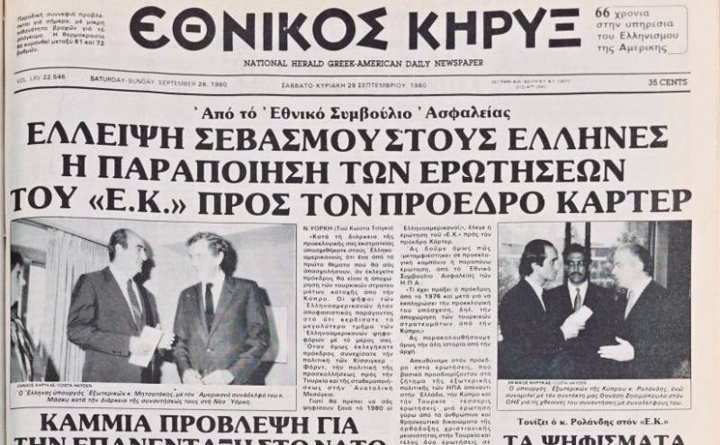 Ετσι, στο φύλλο του Σαββατοκύριακου 28 Σεπτεμβρίου 1980 δημοσιεύσαμε το παρακάτω κείμενο, γραμμένο από τον εκλεκτό συνεργάτη τότε, τον Κώστα Τσίγκα, με υπέρτιτλο: «Από το Εθνικό Συμβούλιο Ασφαλείας» και με 3 γραμμές 7στηλο τίτλο: Ελλειψη σεβασμού στους Ελληνες η παραποίηση των ερωτήσεων του «Ε.Κ.» προς τον πρόεδρο Κάρτερ.