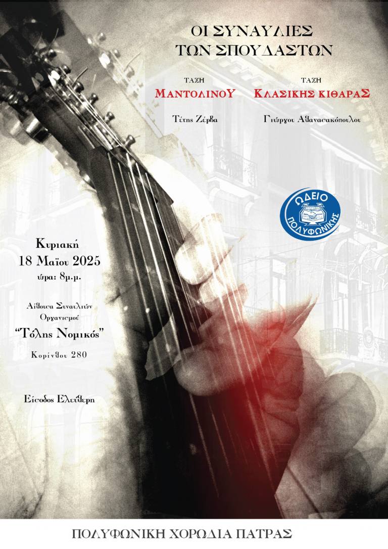 Πρόσθετα την Κυριακή, 18 Μαΐου, στις 8 το βράδυ, στην αίθουσα συναυλιών του Οργανισμού «Τόλης Νομικός», θα πραγματοποιηθεί η 2 η θερινή συναυλία του ΩΔΕΙΟΥ της «ΠΟΛΥΦΩΝΙΚΗΣ», των τάξεων μαντολίνου, καθηγήτριας, Τέτης Ζέρβα και κιθάρας, καθηγητή, Γιώργου Αθανασακόπουλου.