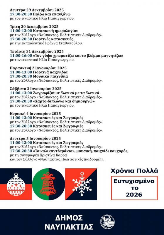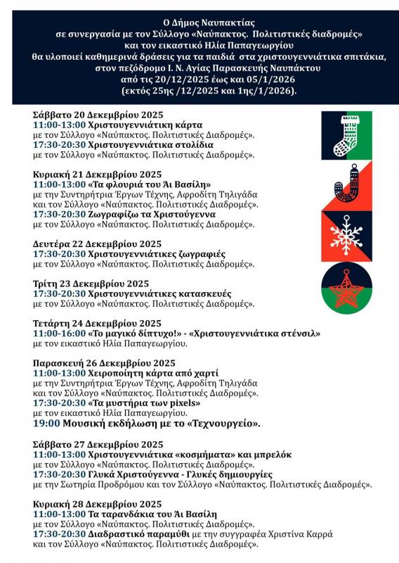 Σε συνεργασία με τον Σύλλογο «Ναύπακτος. Πολιτιστικές διαδρομές» και τον εικαστικό Ηλία Παπαγεωργίου, θα υλοποιούνται καθημερινά δράσεις για τα παιδιά στα αγαπημένα χριστουγεννιάτικα σπιτάκια, που φέτος θα βρίσκονται στον πεζόδρομο Ι. Ν. Αγίας Παρασκευής Ναυπάκτου από τις 20.12.2025 έως και 5.1.2026 (εκτός 25ης.12.2025 και 1ης.1.2026).
