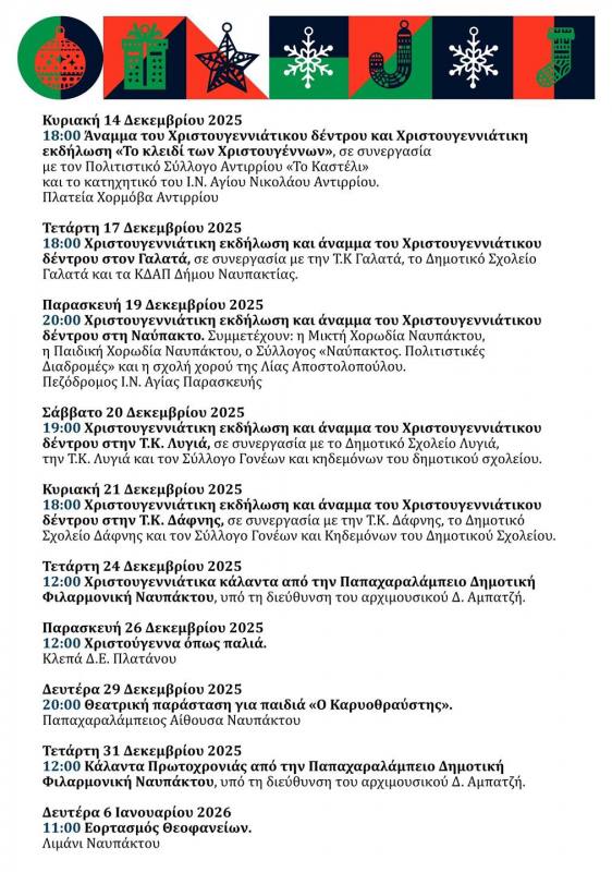 Το Πρόγραμμα Εκδηλώσεων του Δήμου Ναυπακτίας για τα Χριστούγεννα και την Πρωτοχρονιά