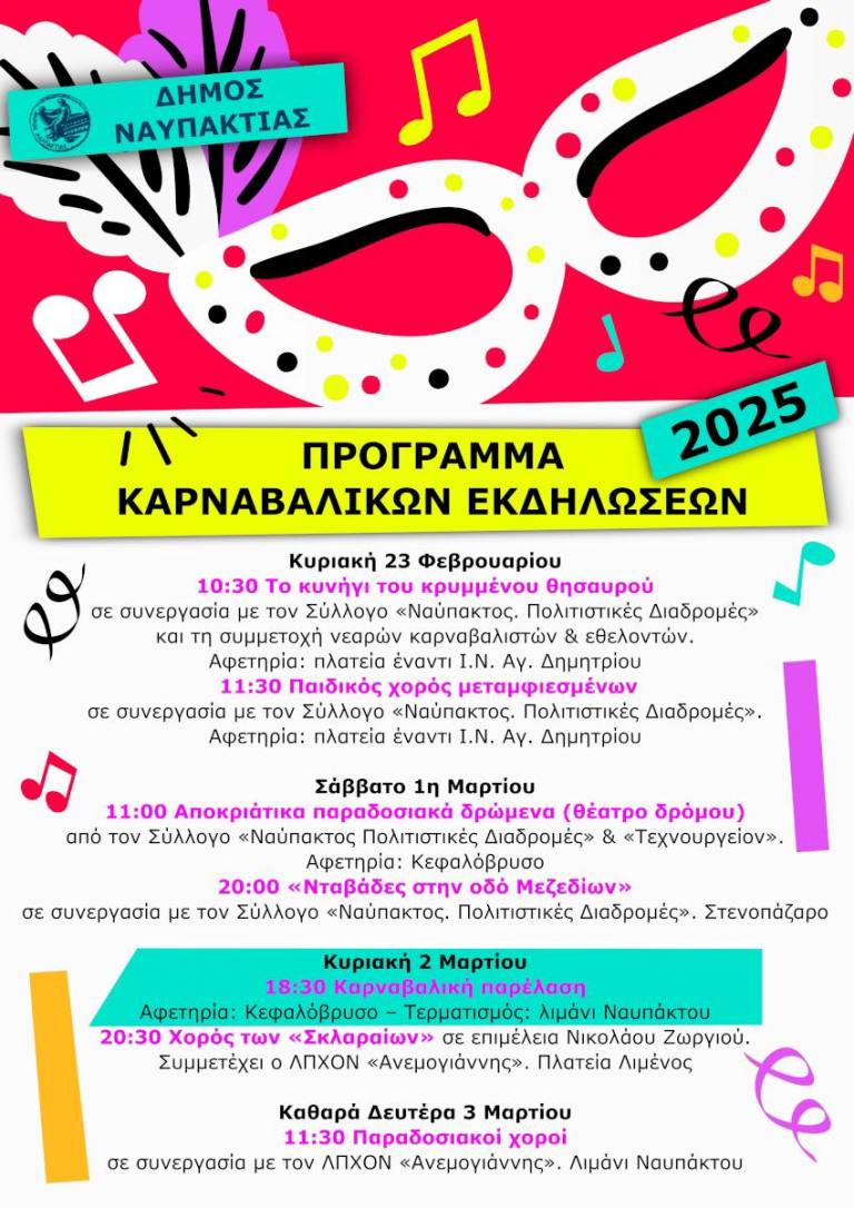 Ο Δήμος Ναυπακτίας προσκαλεί όλες και όλους στις φετινές καρναβαλικές εκδηλώσεις που ξεκινούν αυτή την Κυριακή, 23 Φεβρουαρίου! Πολλές εκπλήξεις για τα παιδιά, κρυμμένος θησαυρός, χορός μεταμφιεσμένων, καρναβαλική παρέλαση, Νταβάδες στην οδό Μεζεδίων, χορός των Σκλαραίων και ανήμερα την Καθαρά Δευτέρα παραδοσιακοί χοροί στο Ενετικό Λιμάνι της πόλης, περιλαμβάνονται στο φετινό πρόγραμμα.